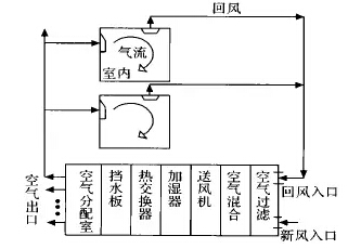 圖1所示的是某酒店中央空調(diào)的示意圖:空氣從回風(fēng)口和新風(fēng)口進入空調(diào)系統(tǒng)入口,入口處設(shè)調(diào)風(fēng)門以控制進風(fēng)量的大小,過濾后的空氣繼續(xù)往前,到空氣混合室,通過送風(fēng)機后,被送去加濕,加濕后的空氣送去冷卻或加溫(隨季節(jié)而定),經(jīng)擋水板,然后,進入空氣分配室,再到送風(fēng)管,最后進入空調(diào)室。