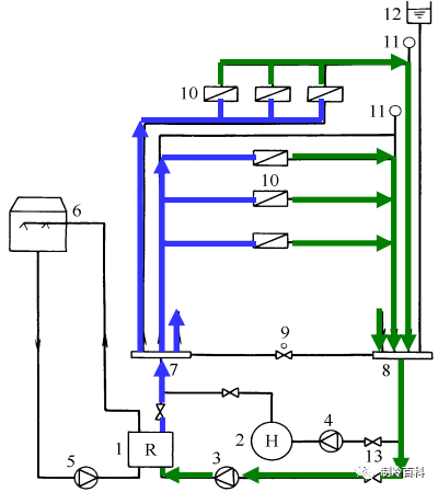 夏季供冷時(shí) :下圖所示,冷水機(jī)組1制出的7℃冷凍水,在冷凍水泵3的作用下送至分水器7,然后由分水器通過各供水支管分別送至各空調(diào)房間或區(qū)域的空調(diào)設(shè)備10。