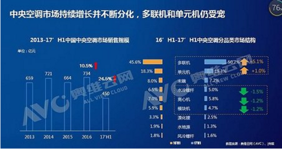 據(jù)張彥斌介紹,水冷機(jī)、離心機(jī)、模塊機(jī)等大型商用中央空調(diào)增幅呈下降趨勢(shì),而多聯(lián)機(jī)、單元機(jī)增速與增幅都非常可觀。2017上半年,多聯(lián)機(jī)市場(chǎng)份額占比增加5.1%,增幅達(dá)50.7%;單元機(jī)市場(chǎng)占比增長(zhǎng)1%,增幅19.3%,而許多主流空調(diào)企業(yè)已經(jīng)或正在將單元機(jī)甚至多聯(lián)機(jī)等戶式中央空調(diào)空調(diào)納入家用空調(diào)的銷(xiāo)售體系內(nèi)。