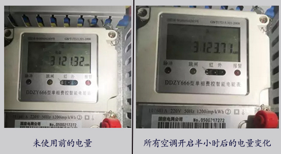 通過很直觀的數(shù)據(jù)我們可以了解到,開啟所有空調,半小時的耗電量僅為(3123.71-3121.32)-(3121.32- 3121.25)×3=2.18kwh。僅開啟一臺測試空調,半小時耗電量僅為(3124.81-3123.71)-(3121.32- 3121.25)×3=0.89kwh,一小時耗電約為1.78kwh左右。
