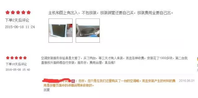 同時(shí),消費(fèi)者對于網(wǎng)購家用中央空調(diào)的反饋意見也比家用空調(diào)多,雖然大部分網(wǎng)友表示滿意,但細(xì)看留言也不乏質(zhì)疑之聲。例如,有消費(fèi)者反映到貨產(chǎn)品有瑕疵,或安裝工人態(tài)度不好,更多的則是對安裝收費(fèi)額度的驚愕,比消費(fèi)者預(yù)想的要高。除了抱怨,我們也能從留言看出網(wǎng)購家用中央空調(diào)安裝上的諸多現(xiàn)狀,很多消費(fèi)者都感嘆家用中央空調(diào)的安裝比自己想象中復(fù)雜。