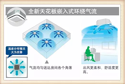從機型來看,天花板嵌入式(環(huán)繞氣流)室內(nèi)機,對應大開間和方形空間,氣流均勻,造型更美觀。溫度分布情況大為改善;天花板嵌入導管內(nèi)藏式室內(nèi)機,對應狹長型、U型和L型等不規(guī)則空間,有多種送回風形式,輕松實現(xiàn)與內(nèi)裝的融合;自由靜壓風管室內(nèi)機,對應不規(guī)則空間和挑高空空間,即使內(nèi)裝格局經(jīng)常改變,也能輕松對應。