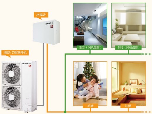 日立地暖+中央空調(diào)一體化系統(tǒng),是采用空氣源熱泵技術(shù),和中央空調(diào)共用一臺(tái)室外機(jī),只是在整個(gè)系統(tǒng)中間增加了一個(gè)水模塊,用來(lái)提升水溫,最后將熱水輸送到地暖盤管內(nèi),加熱地板,從而達(dá)到地板輻射取暖的目的。